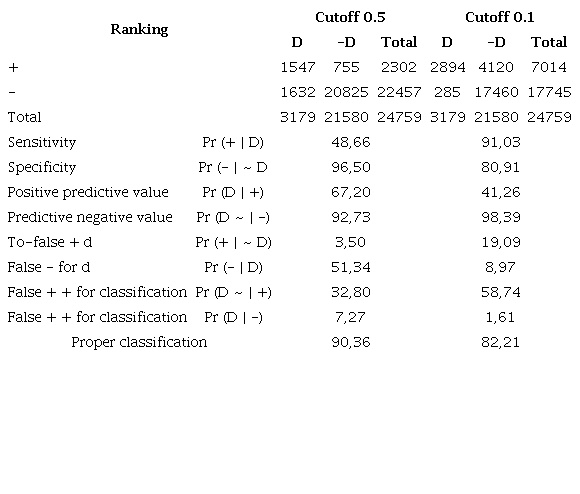 From a cut of 0.1 (10%) can be achieved arrangements for 2302 candidates got success, a percentage of 91,03% of the elect. Regarding specificity, failure hits were reduced to 17460, the 21,580 candidates who do not get success, less precision than in the general model. Considering both situations, the logistic model correctly classified instances and not occurrences in relation to number of observations, a percentage of 82,21%, lower than the 90.36% of the standard application 0.5.