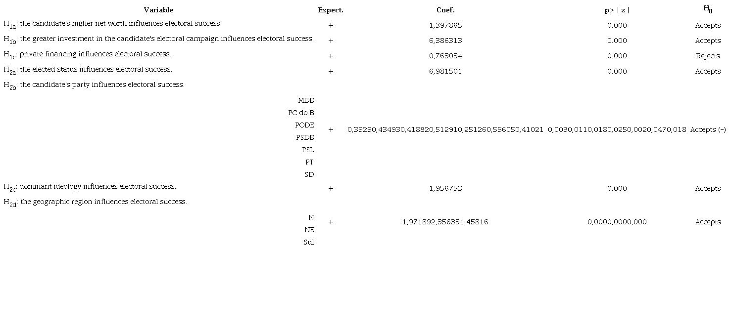 The results of the complementary analyzes showed that in the proposed model, by dividing the geographic regions and the parties, it is possible to identify a number of parties that are capable of influencing electoral success in an inverse way, that is, their candidates have a lower probability of obtaining (Coef., 392 p = .003), PT (Coef., 556 p = .047), PSDB (Coef., 513 p = .025), PC of the B (Coef., 435 p = .011), CAN (Coef., 419 p = .018), PSL (Coef., 251 p = .002), and SD (Coef., 410 p = .018), while the regions that showed greater significance in the model positively influencing candidates from the northeast at 135% and from the north by 97% more chances (Coef. 2,356 p = .0000 and Coef. 1,972 p = .0000) than the reference candidates, from the Midwest.