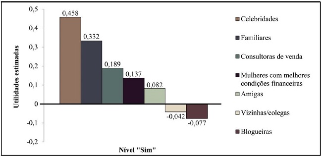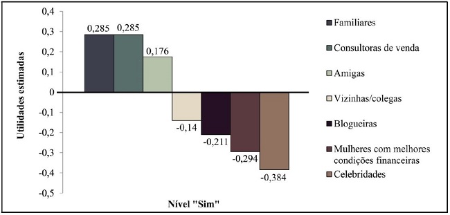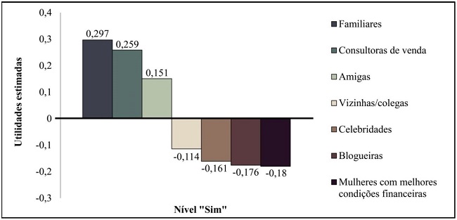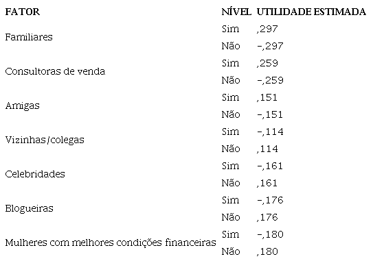Na Tabela 1 observa-se que a participação (sim) de familiares, amigas e consultoras de venda expressa utilidade de valor positivo, demonstrando boa aceitação por parte das respondentes. Por outro lado, a participação (sim) de vizinhas/colegas, celebridades, mulheres com melhores condições financeiras e blogueiras apresenta utilidade de valor negativo, sugerindo baixa aceitação.