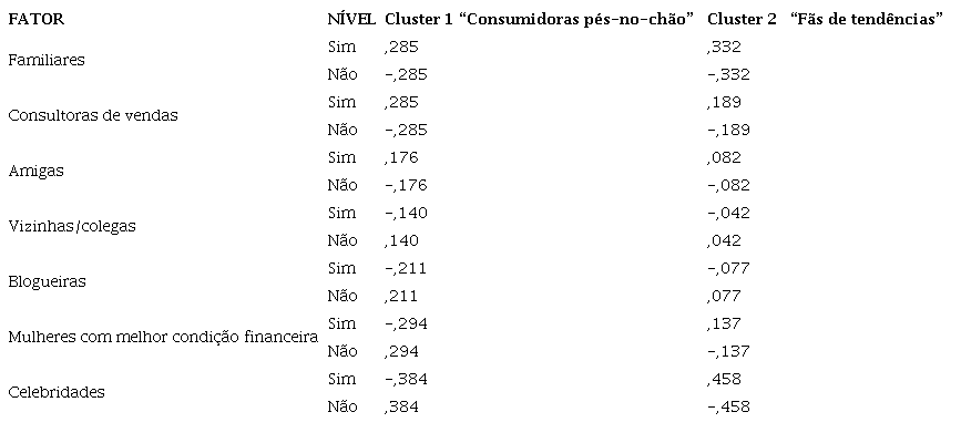 Na sequência, observam-se os grupos de referência que não são valorizados pelos clusters identificados. Embora os vizinhos se destaquem na literatura como um importante grupo de contato, juntamente com os familiares, ( BARROS, 2006; VASCONCELOS; GOMES; LEOCÁDIO, 2015), os resultados da conjoint analysis sugerem o contrário. Acredita-se que essa divergência relaciona-se às situações de compra abordadas. Enquanto o estudo de Vasconcelos, Gomes e Leocádio (2015) refere-se a móveis e eletrodomésticos, isto é, bens associados à ascensão e à distinção social ( CASTILHOS; ROSSI, 2009), o presente estudo envolve uma categoria não relacionada a status ( LIVRAMENTO; HOR-MEYLL; PESSÔA, 2013). As preferências quanto às blogueiras apresentam-se de maneira semelhante. Ainda que na etapa qualitativa, algumas entrevistadas tenham afirmado usar a internet e blogs para buscar informações sobre cosméticos, os resultados da segunda etapa sugerem que esse não é um grupo de referência valorizado pelas respondentes. Possivelmente a baixa aceitação das blogueiras relaciona-se às desconfianças do segmento de baixa renda quanto à internet ( DIAS; HEMAIS, 2015).