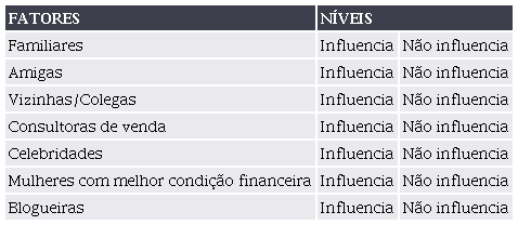Para utilizar essa técnica é preciso conhecer os fatores e níveis relevantes para os consumidores a fim de formular estímulos e cartões adequados. Neste estudo, esses elementos foram definidos com base nas entrevistas da etapa qualitativa ( Quadro 1). Destaca-se que “influencia” e “não influencia” significam, respectivamente, a participação ou não dos diferentes grupos de referência no processo de decisão de compra – tanto de maneira direta (recomendação) quanto indireta (observação).