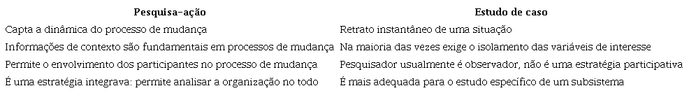 Como consequência, considera-se que o desenvolvimento de projetos de pesquisa-ação está um passo à frente da visão tradicional da pesquisa-ação apenas como meros estudos de caso estendidos (ERRO-GARCÉS; ALFARO-TANCO, 2020). O objetivo da abordagem do estudo de caso configura-se em estudar o caso e não em mudar o caso (OLLILA; YSTRÖM, 2020). Na pesquisa-ação capta-se a dinâmica da organização, sendo que informações relacionadas ao seu contexto são fundamentais para entender o processo de mudança (SILVA; GODOI; MELO, 2010). A criação de métodos que operacionalizam teorias, como a pesquisa-ação, proporcionam o privilégio de não apenas trabalhar intimamente com algumas equipes, mas também, de ver os resultados das intervenções incorporadas na prática organizacional (EDEN; ACKERMANN, 2018).