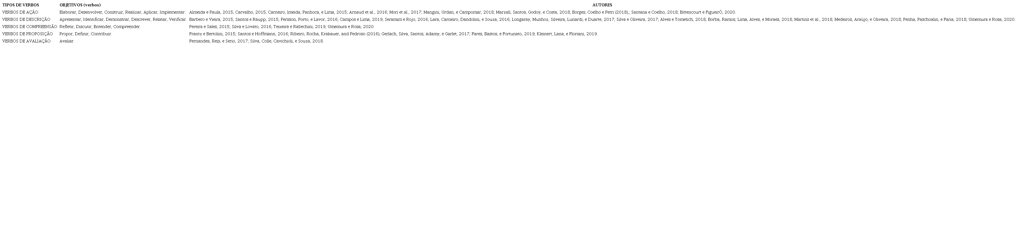 Classificou-se em cinco tipos de verbos encontrados nos objetivos: ação, descrição, compreensão, proposição e avaliação. Os verbos de ação, proposição e avaliação possuem caráter mais ativos em relação à ação. Os verbos de compreensão e descrição possuem papel mais ativo na aprendizagem e conhecimento identificado. Nesse sentido, percebe-se que os artigos têm priorizado a utilização de apenas um verbo no objetivo: ou ligado à prática, ou ao conhecimento (THIOLLENT, 2009; ERRO-GARCÉS; ALFARO-TANCO, 2020).