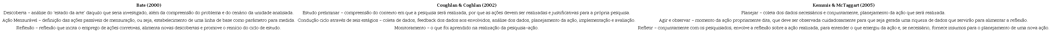 Os autores mais utilizados pelos artigos para uso de definição e utilização de fases da pesquisa-ação foram Thiollent (2009) e Tripp (2005). Outros autores que descrevem fases da pesquisa-ação também foram utilizados: (BATE, 2000; COUGHLAN; COGHLAN, 2002; KEMMIS; MCTAGGART 2005; MACKE, 2006; LODI; THIOLLENT; SAUERBRONN, 2018). A seguir, são apresentadas as fases descritas pelos autores em dois blocos, os autores que apresentam 3 fases e os autores que apresentam 4 fases. O Quadro 4 apresenta as três fases propostas: