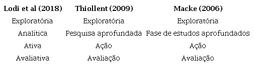 Destaca-se que as fases expostas pelos autores são similares, até mesmo na nomenclatura, em sua maioria. Neste tipo de pesquisa a geração do conhecimento ocorre em todas as fases, possuindo um caráter dinâmico, que possibilita a construção processual de conhecimento, onde estuda-se um processo de mudança planejada (MACKE, 2006).
