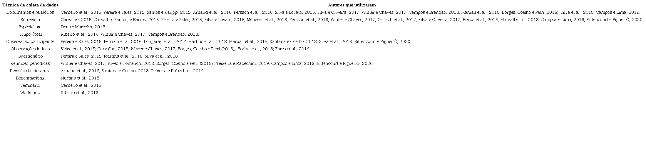 Embora a escolha da forma de coleta de dados fique a cargo do pesquisador em consonância com o seu tipo de pesquisa, os protocolos científicos precisam ser seguidos (LODI; THIOLLENT; SAUERBRONN, 2018; BLEIJENBERGH, VAN MIERLO; BONDAROUK, 2020). Por exemplo, Borges, Coelho e Petri (2018), fizeram uso de observações in loco e reuniões periódicas com gestores, mas não explicitaram os procedimentos, o que deixa os leitores com possíveis dúvidas sobre o protocolo seguido.