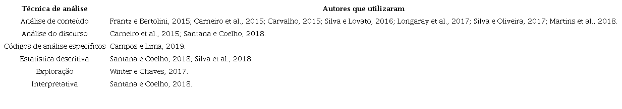 O Quadro 7 apresenta as técnicas de análise de dados utilizadas nas pesquisas verificadas: