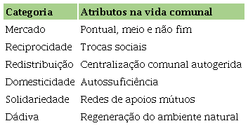 Os resultados a seguir qualificam práticas e relações econômicas variadas e distintas daquelas restritas ao mercado. Em todas as comunidades visitadas, em maior ou menor medida, estão presentes elementos que corroboram a ideia de pluralidade econômica. Na exposição dos resultados, quando necessário, pontuamos diferenças, ausências e similaridades de processos entre as comunidades. O Quadro 1 elenca as categorias econômicas analisadas esquematizando atributos que, na prática, são indissociáveis e formam uma totalidade, inclusive em termos de conflitos e tensões com a economia de mercado. Nas discussões a seguir, todavia, tais categorias são individualizadas, associadas a peculiaridades e especificidades do movimento de ecovilas com base em intenções ecológicas - expressas em atributos da vida comunal, preservação e regeneração dos ecossistemas e autossuficiência. Da mesma forma, pautas contestatórias expressam-se no fortalecimento de redes de apoio, de organizações autogeridas que buscam alternativas à sociedade mercadocêntrica.