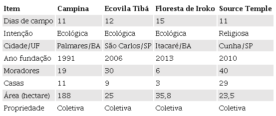 O critério 1 incidiu no processo de escolha pelo fato de que que o termo ecovila é relativamente novo e de amplas concepções conceituais, o que exigiu a autoidentificação do coletivo também como comunidade - diferentemente de noções de condomínios sustentáveis ou rurais que se aproveitam do termo para autopromoção, conforme alerta Siqueira (2012). Os critérios 2 e 3 tiveram por objetivo delimitar comunidades com trajetória já consolidadas em termos de infraestrutura básica para a autossuficiência. O critério 4 foi definido pelo entendimento que a vida comunal, se não exige, pelo menos estimula o compartilhamento dos meios de produção e propriedade no intento de tornar igualitárias as relações entre moradores. Há, portanto, maior complexidade em torno de decisões coletivas, processos de gestão, organização da força de trabalho e compartilhamento de resultados. O critério 5 conecta-se tanto a práticas comunitárias de preservação e recuperação do meio ambiente natural quanto ao caráter do trabalho na produção de bens úteis destinados à autossuficiência. O Quadro 2 informa a quantidade de dias de coleta de dados e características gerais das comunidades pesquisadas.