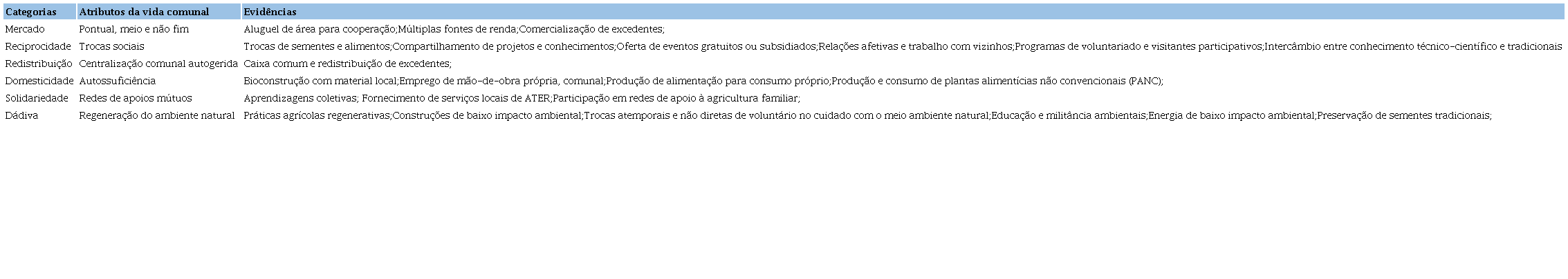Com base nas proposições gerais acima sintetizadas, o Quadro 1 resume categorias de pluralidade econômica e atributos úteis à análise de contexto de vida comunal em ecovilas. Tais atributos, em meio a tensões, impasses e contradições nas dinâmicas comunitárias, expressam vivências de economia plural e, por essa razão, são tomados como referência para o exercício adiante efetuado a partir de pesquisa empírica em quatro ecovilas.