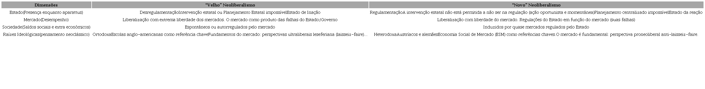 Puello-Socarrás (2008a; 2008b; 2013) distingue, então, dois tipos de neoliberalismo: velho (ortodoxo) baseado na Escola Anglo-Americana e o novo (heterodoxo), baseado na Escola Austríaca. O novo neoliberalismo seria fruto de críticas ao neoliberalismo ortodoxo. Assim, essas novas correntes buscaram a sua reconstituição e permanência. O velho neoliberalismo tem uma conexão forte com as teorias neoclássicas, vinculadas a Escola anglo-americana, na qual há uma desregulamentação e liberalização total dos mercados (PUELLO-SOCORRÁS, 2013). Já o novo neoliberalismo está filiado à Escola Austríaca, na qual o Estado tem como papel a regulamentação. O Quadro 1 sistematiza as diferenças entre os dois tipos de neoliberalismos.