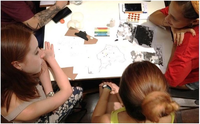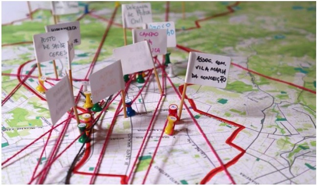 In the workshop of the Present, the participants are encouraged to draw a current diagnosis of the area based on their previous knowledge, socioeconomic data from the Atlas of Human Development (presented on the map of the territory) and cards with urban themes (such as housing, environment, transport, etc.). The activity is divided into five moments: presentation of the participants and the project; training, which may or may not happen because of the schedule of the workshop; identification of landmarks in the region and conflictive areas (Figure 3); selection of the priority themes of the Borough, with a description of the positive and negative issues and their location on the map; presentation of the previous activity to the large group. Concurrently, the participants urban practice in everyday life is elaborates at the map, in which each participant identifies the main displacements of his or her daily life on the map, with the help of pins to mark places and colorful lines to trace the routes (Figure 4). Adaptations of the model of the workshop are planned considering duration and participants (Figure 5 and 6).
