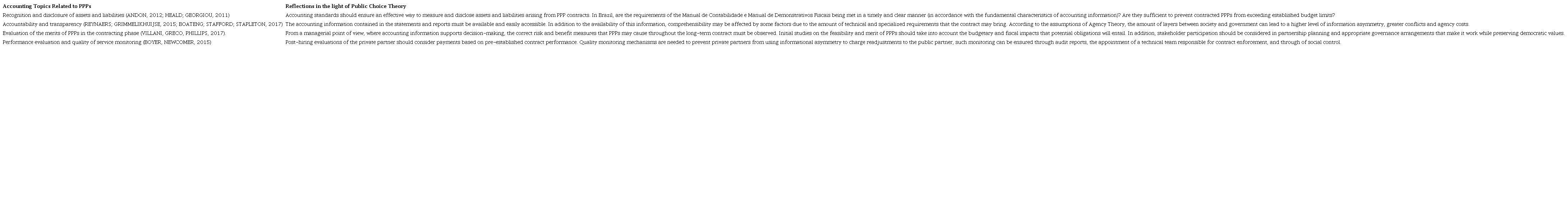 In particular, the implications of PPPs accounting treatment (which involves resource management, performance appraisal and control) should be considered at all project phases to ensure better decisions and merit of partnerships throughout the contract (ANDON, 2012; OPARA; ROUSE, 2018). It is emphasized the need for research that reinforces the role of accounting not only as a facilitator of decision making in the hybrid structures of PPPs, but also as an instrument of accountability and social control.Table 1 summarizes some accounting questions and topics that should be considered to prevent private interest from overriding the public interest in contracting a PPP.