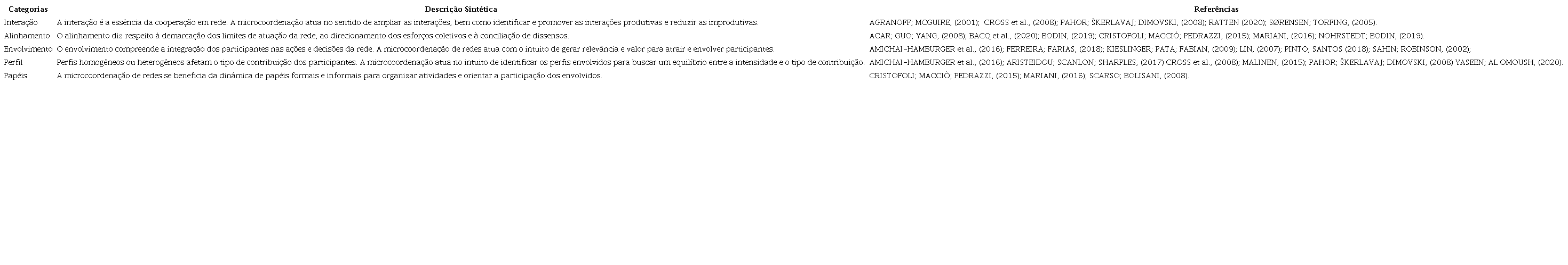 O esforço conjunto para mitigar os efeitos da pandemia do novo coronavírus, na forma da maratona online Hack for Brazil | Covid-19, demonstra as potencialidades da cooperação e conforma um campo empírico rico para o estudo da coordenação de redes. Ao elencar as questões da complexa microcoordenação da cooperação em redes de grande escala, este artigo se alinha aos estudos que enfatizam a eficácia de funções e mecanismos para o alcance dos objetivos coletivos (ALBERS, 2010; MORETTI, 2017). Deste referencial teórico, cinco categorias de análise foram destacadas: interação; alinhamento; envolvimento; perfil; e papéis. Eles estão sintetizados no Quadro 1 em orientação às discussões dos resultados para a microcoordenação de redes.