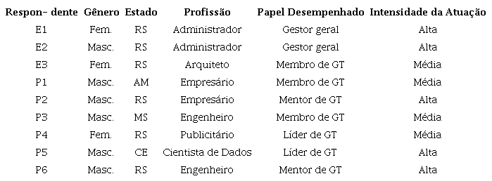 A escolha da coleta de evidências por grupo focal se deu pela interdependência dinâmica entre as percepções, opiniões e reações dos participantes que esta técnica propicia (COLLIS; HUSSEY, 2005). A dinâmica de pares em grupo estimula o compartilhamento das experiências e, sobretudo, provoca sentimentos e realça memórias que tornam as contribuições individuais dos participantes mais fiéis ao fenômeno (KRUEGER; CASEY, 2008). A coleta ocorreu no mês de maio de 2020, cerca de 40 dias após a realização do hackathon. Em decorrência da necessidade de isolamento social na data, optou-se pela realização do grupo focal na plataforma MS Teams©, apoiando-se nas possibilidades de comunicação, colaboração, gravação e armazenamento da ferramenta. A seleção dos participantes teve como parâmetros o gênero, a procedência, a profissão, o papel desempenhado e a intensidade da atuação. A intensidade foi estabelecida de acordo com a contribuição de cada participante nas atividades do hackathon, parametrizada pelo seu protagonismo online e nos grupos de trabalho. Assim, a alta intensidade consistia na participação do respondente como protagonista nas atividades online ou na interação com o seu grupo de trabalho. A média intensidade consistia na participação sem protagonismo nas atividades online ou na interação com o seu grupo de trabalho. A baixa intensidade consistia na falta de participação nas atividades on-line ou na interação com o seu grupo de trabalho. Ao todo, seis indivíduos aceitaram participar do grupo focal em estudo. As características dos entrevistados (E1, E2, E3) e dos participantes do grupo focal (P1, P2, P3 ...) são sintetizadas no Quadro 2, de forma aleatória, a fim de preservar a identidade dos respondentes.