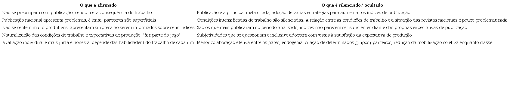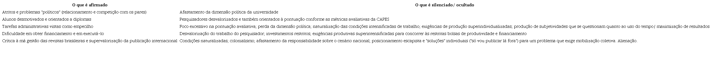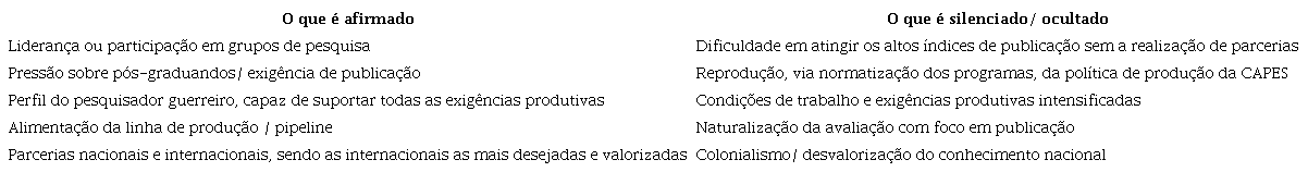 O Quadro 1 resume os principais achados em relação à política de avaliação científica da CAPES, contrapondo o que é afirmado ao que é silenciado/ ocultado: