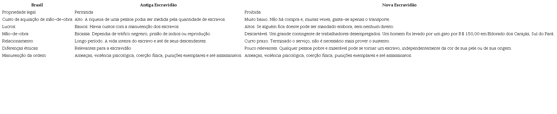 Para além das disputas semânticas e das configurações legais que definem o crime, no entanto, é certo que a escravidão contemporânea “é tão vantajosa para os empresários atuais, quanto era para os traficantes negreiros do Brasil Colônia e Império, pelo menos do ponto de vista financeiro e operacional”, conforme estudo realizado pelo sociólogo americano Kevin Bales, considerado um dos maiores especialistas no tema, seus dados foram adaptados pelos autores do relatório da OIT para a realidade brasileira e pode ser conferido no Quadro 1 (BALES, 1993, apud OIT, 2006, p. 34).