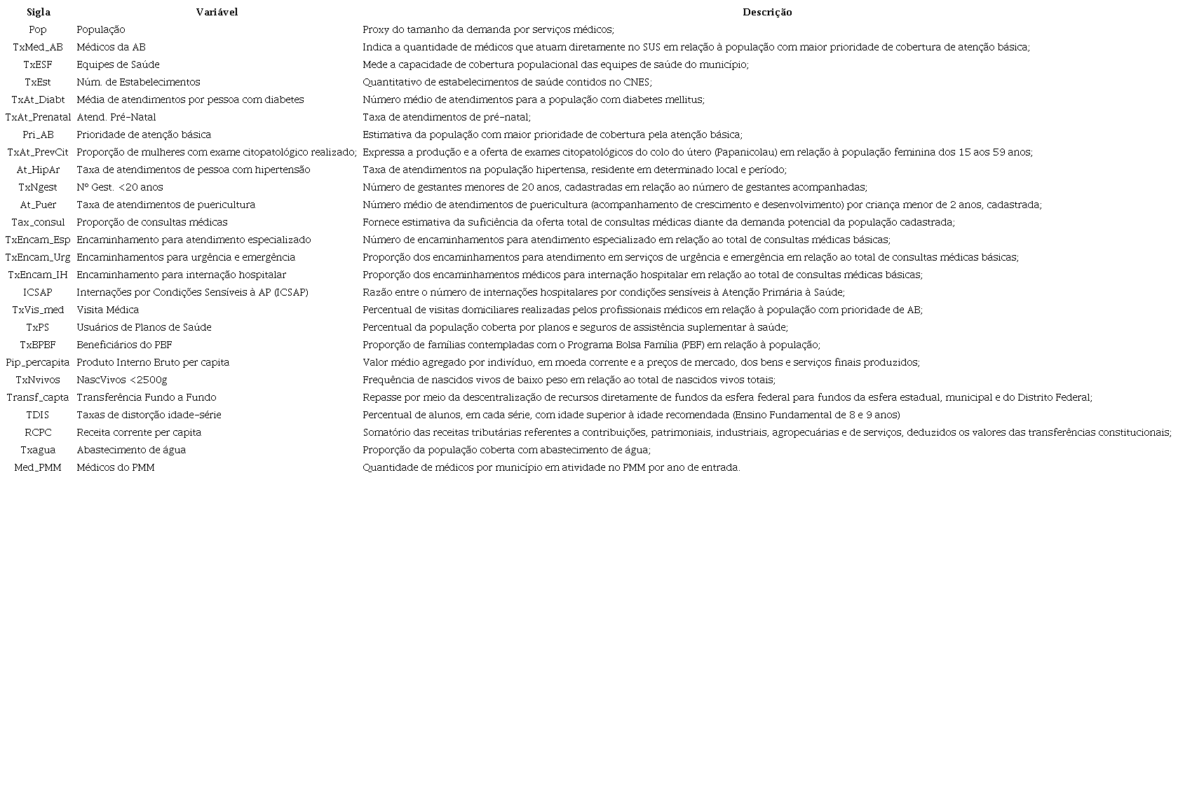 De posse do agrupamento e estratificação, inicialmente, realizou-se a análise descritiva das variáveis adotadas, as quais se encontram dispostas na Tabela 1. Esta análise possibilitou contemplar o objetivo específico de identificar e caracterizar os municípios mineiros em relação ao provimento de profissionais da saúde ao observar seus indicadores socioeconômicos.