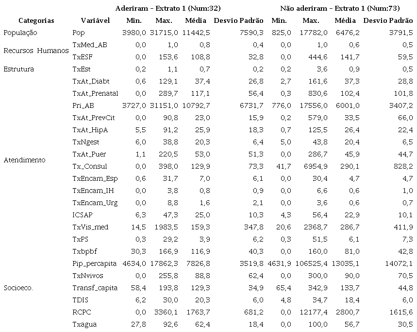 Encontram-se neste tópico as estatísticas descritivas das variáveis. Utilizaram-se dados do ano de 2013 com o objetivo de caracterizar os municípios do Estado de Minas Gerais no seu primeiro ano de implementação, considerando os grupos anteriormente divididos, que aderiram (Grupo 1) e não aderiram (Grupo 2) ao programa. As análises também foram divididas em quatro extratos e em categorias, conforme descrito na metodologia. A comparação entre os dois grupos para o Extrato 1 encontra-se disposta na Tabela 2.