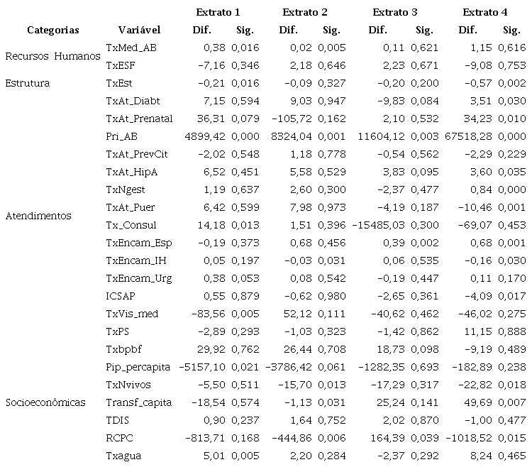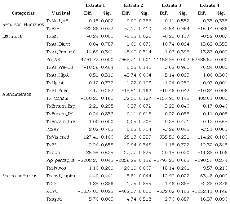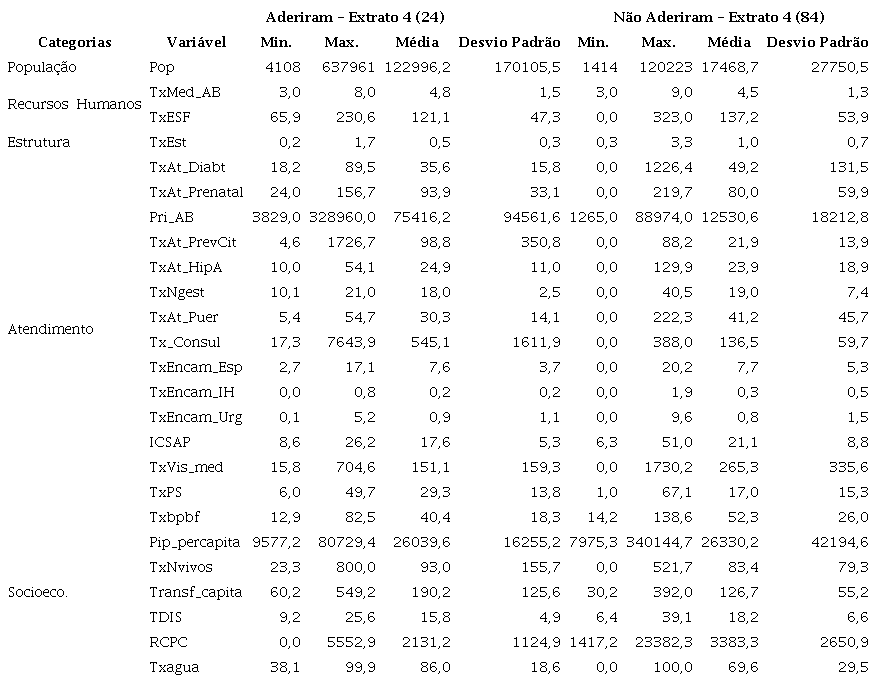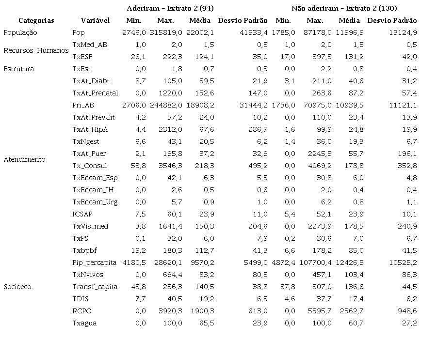 Destaca-se que a estratificação se torna necessária para comparar municípios semelhantes que aderiram e não aderiram ao Programa. Assim, cada um dos dois grupos foi estratificado em quatro extratos, sendo eles, Extrato 1: de 0 a 1 médicos; Extrato 2: de 1 a 2 médicos; Extrato 3: de 2 a 3 médicos; Extrato 4: acima de 3 médicos. As análises também foram separadas por categorias (População, Recursos Humanos, Estrutura e Atendimentos).