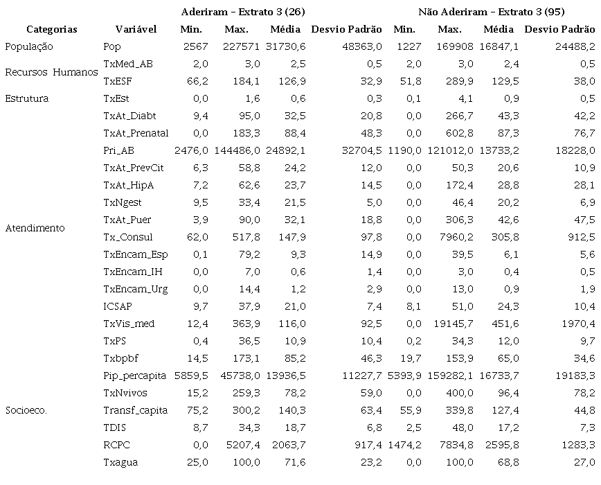 A comparação entre os indicadores dos municípios enquadrados no Extrato 3, que aderiram ou não ao programa, permite constatar o alcance de valores próximos na maioria dos indicadores. Embora os valores relativos aos indicadores da taxa de consultas médicas em geral, da taxa de visita médica e da taxa de nascidos vivos tenham sido diferentes. Enquanto isso, nos extratos anteriores, tais indicadores foram maiores nos municípios que não aderiram ao programa, possivelmente pelo fato de se observar o início de um melhor desempenho nos indicadores de saúde.