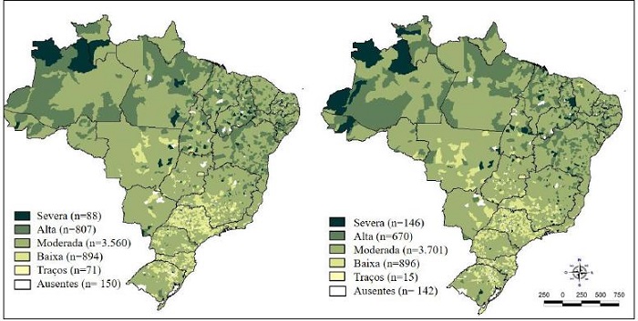 A partir de então ele foi categorizado considerando o desvio padrão. Cinco faixas de vulnerabilidade e condições em saúde foram apontadas no estudo. Do menor valor até dois desvios padrão abaixo da média, a vulnerabilidade em saúde foi classificada como severa. Entre o segundo e o primeiro desvio abaixo da média, a vulnerabilidade foi classificada como alta. Um desvio em torno (abaixo e acima) da média, considerou como moderada a vulnerabilidade. Do primeiro desvio acima da média até o segundo, a vulnerabilidade foi considerada como baixa. Por fim, acima de dois desvios até o valor máximo, indicou traços de vulnerabilidade em saúde. O resultado da distribuição dos municípios brasileiros segundo os graus de vulnerabilidade do IVCS pode ser visualizado na figura 01.