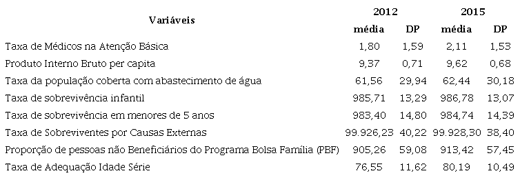 Os dados também relevam mudanças positivas nos valores médios de todas as variáveis entre os anos de 2012 e 2015. Um dos exemplos positivos de melhoria pode ser observado na Taxa de Sobrevivência Infantil (TSI) que melhorou de 2012 para 2015. A mortalidade infantil vinha apresentando tendência de declínio desde a década de 1990 até 2015 (BRASIL, 2018), como quedas mais acentuadas na região Nordeste. Historicamente a região possuía os níveis mais elevados de mortalidade nessa faixa etária (FRANÇA et al., 2017). Todavia, a taxa apresentou crescimento de 2015 para 2016 em função de retrações nas condições de vida e na piora do acesso aos serviços de saúde (REIS, 2018).