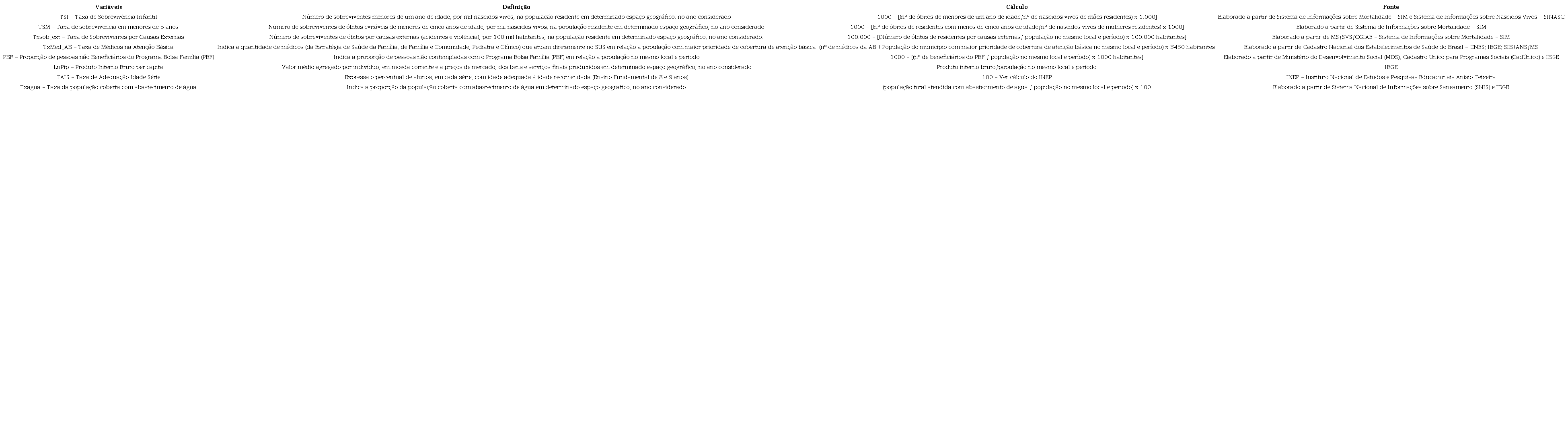 Ampliações nos valores das taxas acima indicam piora nas condições de saúde. Em vistas disso, para que todas as variáveis estejam na mesma direção conceitual, isto é, para que aumentos nas variáveis epidemiológicas e socioeconômicas (discutidas na sequência), represente condições favoráveis de saúde da população, procedeu-se à inversão quando necessário. Assim, as três taxas acima, em vez de serem de óbitos, passaram a ser de sobrevivência - infantil, de menores de 5 anos e por causas externas.