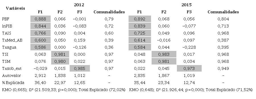 O resultado da análise fatorial com as estatísticas e suas sínteses pode ser observado na tabela 2. Nos dois períodos considerados no estudo, valendo-se das mesmas variáveis, a técnica apontou a formação três fatores para as oito variáveis socioeconômicas e epidemiológicas utilizadas para a construção do IVCS. O valor total explicado nos dois momentos ficou próximo. Em 2012, a variância total explicada foi de 72,02% e, em 2015, os três fatores explicavam juntos, 71,52% dos dados.