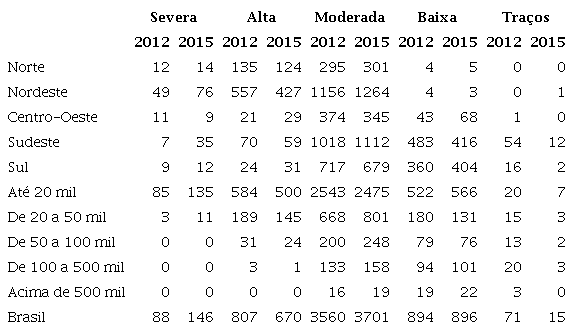De acordo com o IVCS de 2012, grande parte dos 88 municípios classificados em situação severa eram das regiões Nordeste (57,7%) e Norte (13,6%) do país. Situação que se repetiu em 2015 para a região Nordeste (52,1%). Em relação ao porte populacional desses municípios, 96,6% eram de pequeno porte em 2012, com até 20 mil habitantes. Padrão que se repetiu em 2015. Dos 146 municípios em situação severa em 2015, a maioria (92,5% ou 135) eram de pequeno porte. Os demais, 7,5%, possuíam de 20 a 50 mil habitantes.