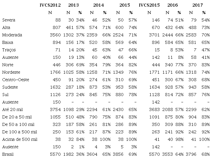 Nas duas faixas do estrato em melhores condições de vulnerabilidade, baixa e traços, percebe-se uma ampliação da representatividade dos municípios das regiões Centro-Oeste, Sudeste e Sul do país em ambos períodos, representando mais de 90% do total de municípios de cada um dos estratos do IVCS. Os pequenos municípios diminuíram sua participação nessas faixas do índice, enquanto, aqueles maiores, com mais de 100 mil habitantes ampliaram sua representatividade. Os grandes municípios, com mais 500 mil habitantes em sua maioria foram classificados nos estratos de menor vulnerabilidade em saúde.