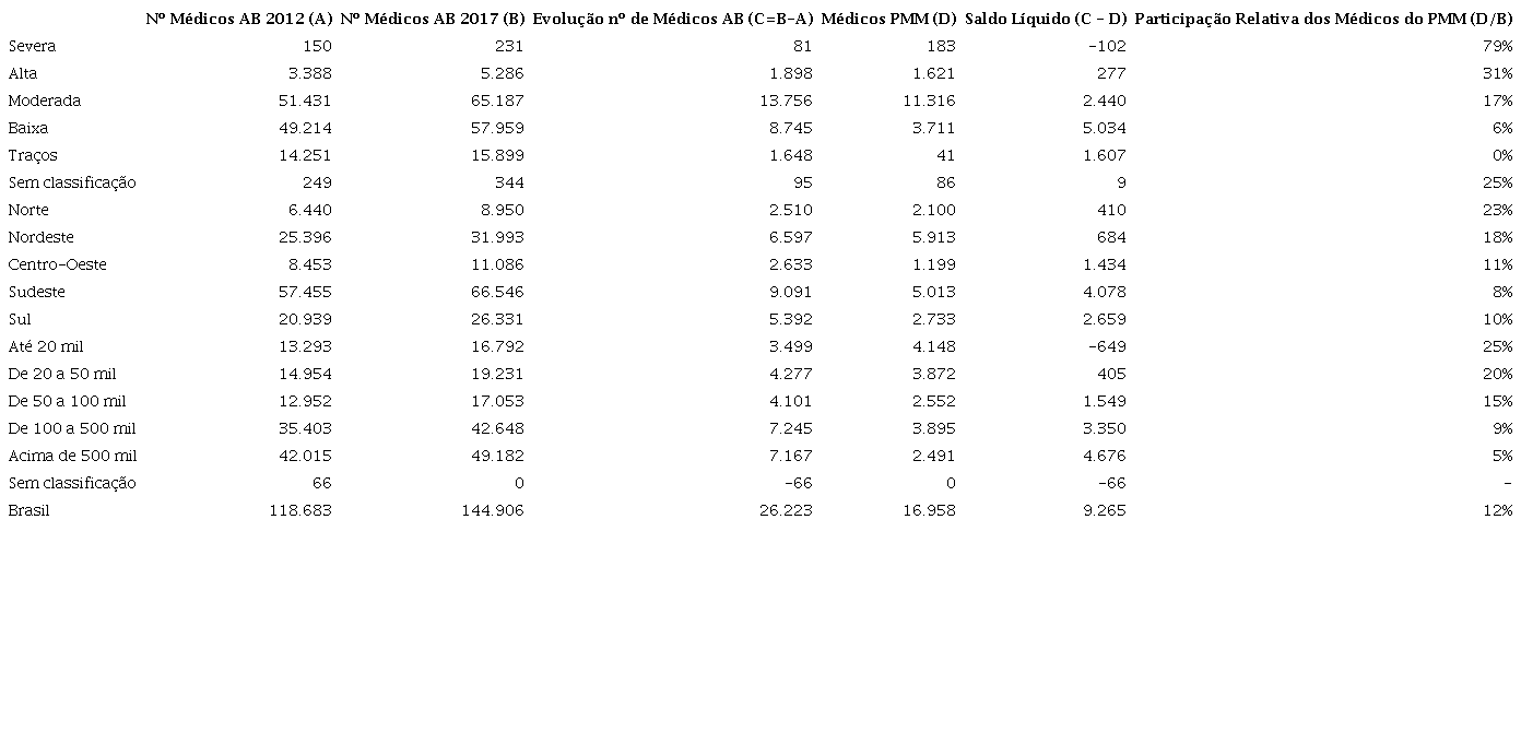 A taxa de médicos na AB no país no período de comparação, apresentou crescimento médio de 1,80 em 2012, para 2,11 em 2015. Os mesmos dados em 2017, indicam uma taxa de médicos na AB de 2,24. Entre 2012 e 2017 houve um crescimento absoluto de 26.203 médicos, se clínico, da estratégia de Saúde da Família, de família e comunidade ou pediatra no Brasil. Esse incremento foi maior do que o número de médicos no PMM, de 16.958 que estavam em atividade no ano de 2017. A diferença permite indicar que houve no período um incremento absoluto de 9.265 médicos para os municípios brasileiros no período. A distribuição e ampliação do número de médicos será detalhado mais à frente após a definição do IVCS.