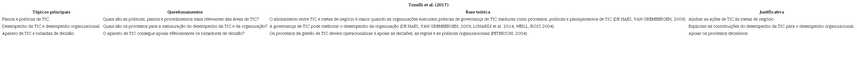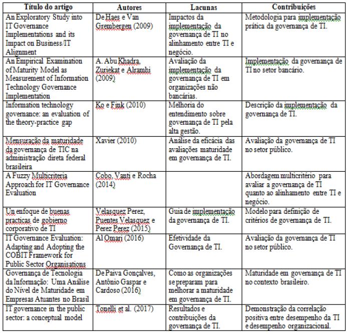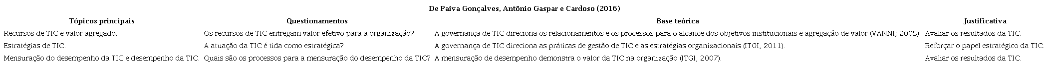 Para o levantamento dos critérios da maturidade em governança e gestão de TIC, analisaram-se os artigos supracitados para identificar os tópicos abordados, questionamentos relevantes, a base teórica vinculada e as justificativas das mesmas. Os Quadros 3 e 4 apresentam uma amostra desse levantamento realizado nas publicações de De Paiva Gonçalves, Antônio Gaspar e Cardoso (2016) e Tonelli et al. (2017). Aplicou-se esse mesmo raciocínio em todos os artigos acima apresentados.