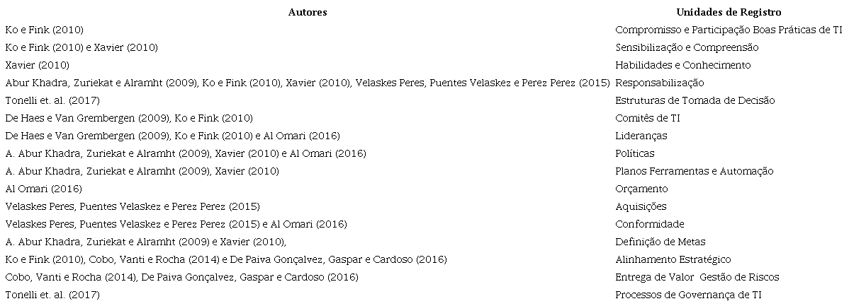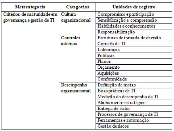 Para esta pesquisa, a macrocategoria foi definida pelo próprio objeto da pesquisa “critérios de maturidade em governança de TI”. As categorias foram definidas a partir dos critérios de maturidade em governança de TIC extraídos da literatura pela interpretação da dimensão de perspectiva dos autores. A afinidade de conteúdos abordados foi o critério final para validação do acoplamento realizado. O Quadro 7 apresenta a consolidação da Metacategoria, Categorias e Unidades de Registros obtidas.