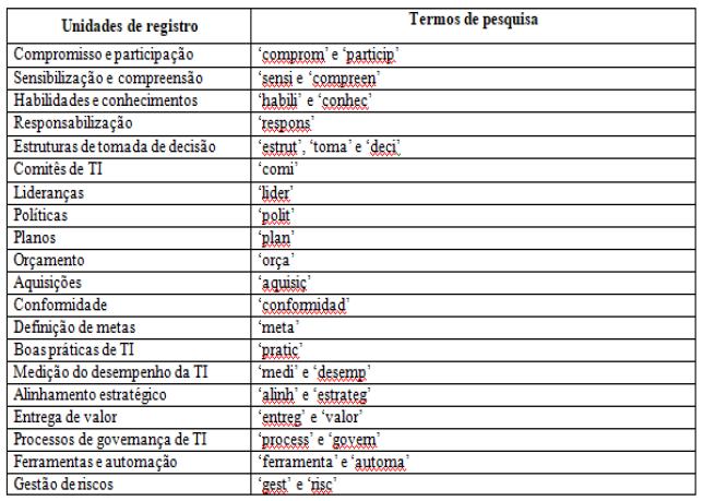 A partir das categorizações obtidas com a Análise de Conteúdo, desenvolveu-se termos de pesquisa. O Quadro 8 apresenta as unidades de registro e seus respectivos termos de pesquisas.