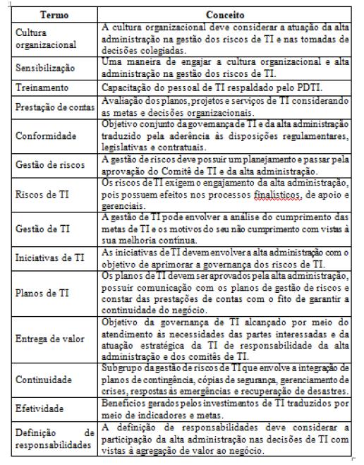 Considerou-se que 'Desempenho organizacional' pode englobar as unidades de registro 'Definição de metas', 'Boas práticas de TIC', 'Medição do desempenho da TIC', 'Alinhamento estratégico', 'Entrega de valor', 'Processos de governança de TIC', 'Ferramentas e automação' e 'Gestão de riscos' visto que conforme Neely et al. (2000), Teló (2001) e Machado Padilha et al. (2010), o desempenho organizacional envolve considerações quanto à geração de valor agregado, inovações tecnológicas, eficiência, riscos, alinhamento de objetivos e metas, integrações entre departamentos e sistemas de medição e ferramentas de gestão.