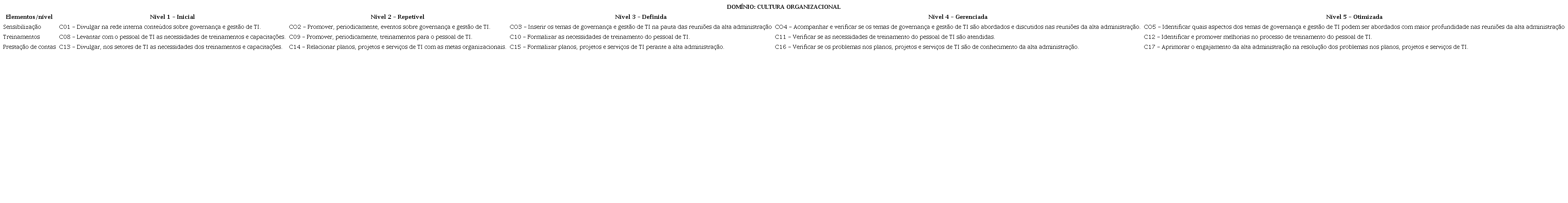 A estrutura referente ao domínio “Cultura Organizacional” com os respectivos elementos e práticas separados por nível está apresentada no Quadro 10. A cultura organizacional é um sistema de valores compartilhados com diferenças marcantes nos níveis de inovação, estabilidade, resultados, gestão de pessoal e competitividade (ROBBINS, 2012).