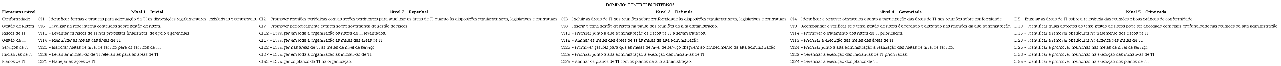 O Quadro 11 se refere ao domínio Controles Internos, os elementos e práticas separados por nível. A melhoria dos controles internos deve levar em conta a identificação e a mensuração dos riscos organizacionais (MARTIN et al., 2004).