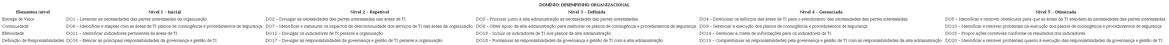 É interessante uma análise supondo que a organização alcançou os níveis 0, 2, 3 e 5 nos elementos do domínio - Desempenho organizacional. Então, para esse domínio, o nível de maturidade será 0 - Inexistente, pois se considera a menor nota obtida nas avaliações. O intuito é estimular que as instituições do SISP aprimorem os seus elementos de governança e gestão de TIC como um todo e não apenas em áreas e aspectos específicos. Essa mesma lógica se aplica também aos demais domínios.