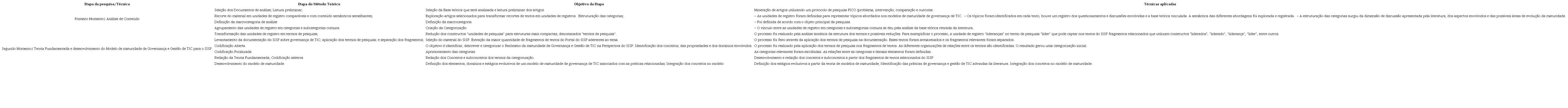 De posse dos conceitos elaborados via Teoria Fundamentada, desenvolveram-se os elementos, estágios evolutivos e domínios de um modelo de maturidade. Na sequência, foram integradas as práticas para se avaliar a maturidade da governança e gestão de TIC nos órgãos do SISP. O Quadro 1, explicita o método realizado no desenvolvimento da pesquisa, apresentando o objetivo de cada etapa e as técnicas aplicadas para obtenção dos resultados.
