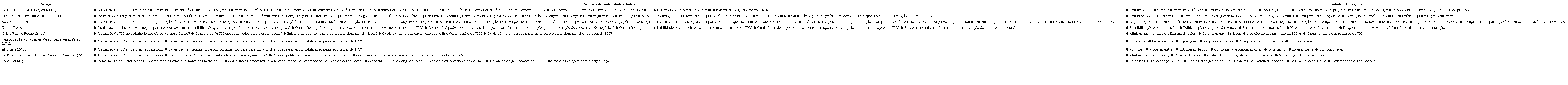 O Quadro 5 apresenta uma síntese com a relação dos critérios de maturidade em governança e gestão de TIC levantados por meio da análise de conteúdo separados por autor. A partir desses critérios, foi possível extrair unidades de registro para aplicação posterior nas pesquisas na documentação do SISP.