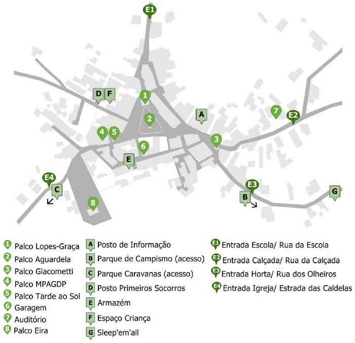 Como pode ser visto na figura 1, a aldeia é fechada para realização do festival e todo o recinto passa a ser Bons Sons. É tudo muito orgânico e a transformação acontece do dia para noite. Na noite da quinta-feira acontece a recepção ao campista e na manhã da sexta a aldeia é tomada por uma multidão ansiosa por vivenciar tudo que aquelas pessoas e aquele espaço podem oferecer. As cinco vias de acesso a Cem Soldos são fechadas e em quatro delas são postos pontos de entrada. A única via que fica fechada e não se constitui como entrada é a rua do pôr do sol, na qual fica o espaço criança e o posto de pronto socorro.