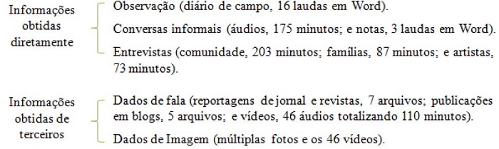 No estudo, em pauta, os construtos foram obtidos, principalmente, por meio de observação participante, conversas e diálogos informais, diários de campo, fotos e vídeos e entrevistas abertas, evitou-se entrevistas formalizadas, estas foram realizadas de modo informal e aberto, sem roteiro, no contexto em que as pessoas estavam atuando. Mas, também foram usadas informações de terceiros, advindas de materiais divulgados em jornais e revistas, de blogs e páginas pessoais vinculadas em domínio público, de sites e páginas oficiais do evento e de documentos de acesso restrito obtidos por intermédio dos membros de organização do evento. Na figura 2 é possível ver a composição do corpus deste estudo.