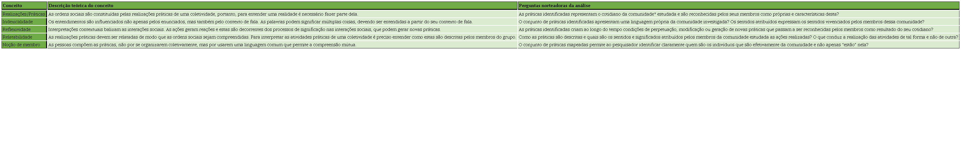 Tendo com finalidade subsidiar a análise e posterior interpretação dos dados, optou-se por usar os principais conceitos da etnometodologia a fim de gerar um protocolo para a análise de dados. Para tanto, tomou-se como base um quadro proposto por Bispo e Godoy (2014, p. 129) com a finalidade de explicitar como cada um destes conceitos (práticas/realizações, indexicalidade, reflexividade, relatabilidade e noção de membro) contribui no processo de análise e interpretação dos dados. A concepção do protocolo foi uma adaptação da proposta de Bispo e Godoy (2014) para o estudo, sendo os conceitos gerados a partir da interpretação dos conceitos teóricos trabalhados anteriormente, conforme figura 3.