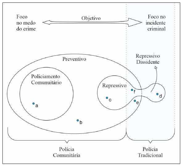 Na Figura 1, as práticas policiais foram dispostas em seis grupos, quanto aos seus objetivos. Esses grupos são exemplificados pelas seguintes práticas: (ponto a) reuniões comunitárias executadas pelos policiais; (ponto b) patrulhamentos ostensivos realizados, com fins preventivos, por meio do contato comunitário; (ponto c) atendimento emergencial de uma ocorrência policial, visando prevenir crimes por meio da persecução penal, da recuperação social do infrator e do auxílio à vítima; (ponto d) atendimento de uma ocorrência policial de alta periculosidade e extrema complexidade, essencialmente repressivo, como quando a captura do criminoso e/ou restauração da ordem pública torna-se objetivo primal; (ponto e) patrulhamentos ostensivos em locais de grande movimento de pessoas, com fim de dissuadir infratores, sem realizar a interação comunitária; (ponto f) atendimento de uma ocorrência policial, que visa prevenir futuras infrações por meio, apenas, da autuação do infrator ou do encarceramento do criminoso.
