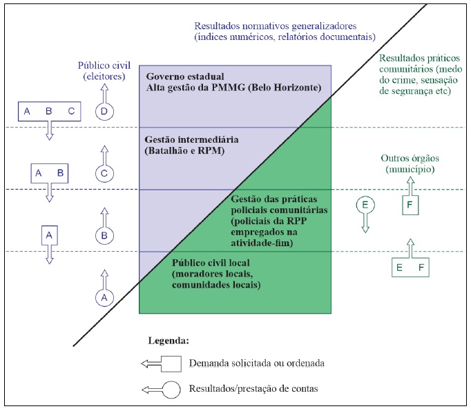 Para a análise dos resultados esperados foi elaborada a Figura 2, construída a partir das demandas recebidas pelos diferentes níveis hierárquicos da organização e da prestação de contas. A pesquisa mostrou uma dicotomia entre os resultados práticos, presentes no atendimento cotidiano da comunidade local, visando alcançar uma sensação de segurança e os resultados normativos generalizadores, presentes nos documentos e relatórios gerenciais, produzidos tanto pelos policiais empregados na RPP quanto pelos policiais gestores.