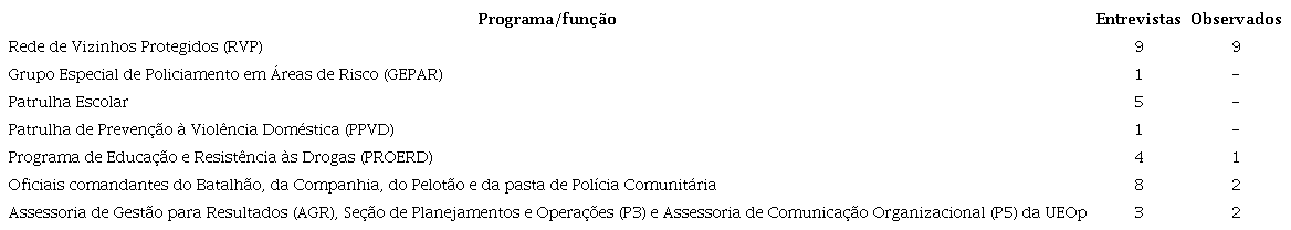 Todas as equipes que atuavam no programa Rede de Vizinhos Protegidos (RVP) no 17º BPM foram acompanhadas por meio da observação participante, o que totalizou 106 horas da seguinte forma: 5 horas com o chefe da Assessoria da Gestão para Resultados (AGR/17º BPM), na Seção de Planejamentos e Operações (P3/17º BPM); 1 hora com um comandante de Companhia PM; 2 horas com o Proerd (Programa Educacional de Resistência às Drogas e à Violência); e, 98 horas com as equipes policiais empregadas na RVP, dentre as quais, 29 horas foram destinadas às reuniões comunitárias, dos policiais com o público civil.