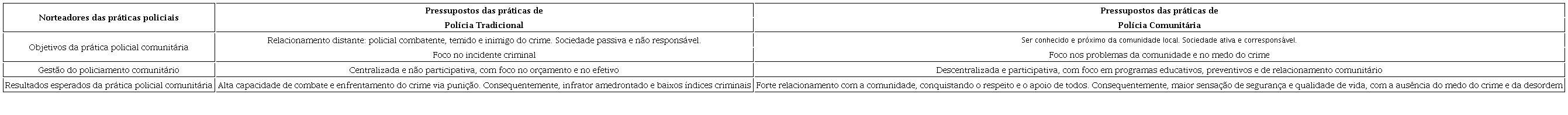 A Polícia Comunitária é uma estratégia de segurança pública que coloca em evidência a parceria entre a população/o público e a polícia. O Quadro 1 sintetiza os pressupostos da Polícia Comunitária e os pressupostos da Polícia Tradicional. Os pressupostos da Polícia Comunitária estão presentes em todos os Estados brasileiros (TASCA et al., 2012); também em países da América Latina (FRÜHLING, 2007) e nas democracias ao redor do mundo (SKOLNICK; BAYLEY, 2006). O entendimento comum é que a sociedade civil e suas diversas instituições devem participar diretamente na melhoria dos serviços públicos de segurança.