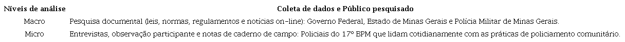 Para a coleta de dados foram aplicadas as seguintes técnicas: (a) pesquisa documental (RICHARDSON, 2012) em leis e regulamentos sobre a atuação policial no Brasil e em Minas Gerais; (b) entrevistas episódicas (FLICK, 2003) com duração média de 90 minutos e um total de 26 entrevistados, realizada com policiais que atuam diretamente no policiamento comunitário, incluindo os comandantes do batalhão e das companhias do 17º BPM; e, (c) observação participante (RICHARDSON, 2012; SELLTIZ; WRIGHTSMAN; COOK, 1987) das equipes de policiamento comunitário do batalhão e das equipes gestoras, em um total de 106 horas. Para fins de confidencialidade, os entrevistados serão identificados, no presente texto, pelo código E (E1, E2, E3 e outros).