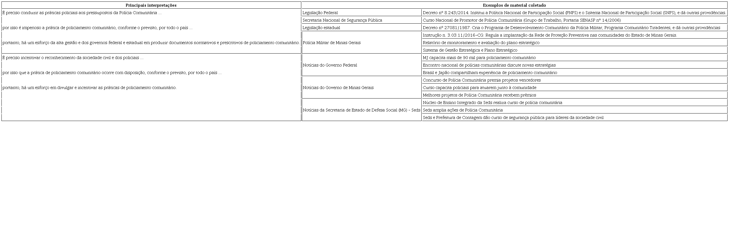 A pesquisa mostrou que os repertórios do nível macro (pesquisa documental de leis, normas, regulamentos e notícias on-line do Governo Federal, do Estado de Minas Gerais e da Polícia Militar de Minas Gerais), apresentados no Quadro 3, foram ressignificados pelas interpretações de policiais militares do 17º BPM que lidam cotidianamente com as práticas de policiamento comunitário, conforme os repertórios que emergiram das entrevistas, da observação participante e dos registros em Caderno de Campo da pesquisa em grupos virtuais da rede social WhatsApp, apresentados no Quadro 4.